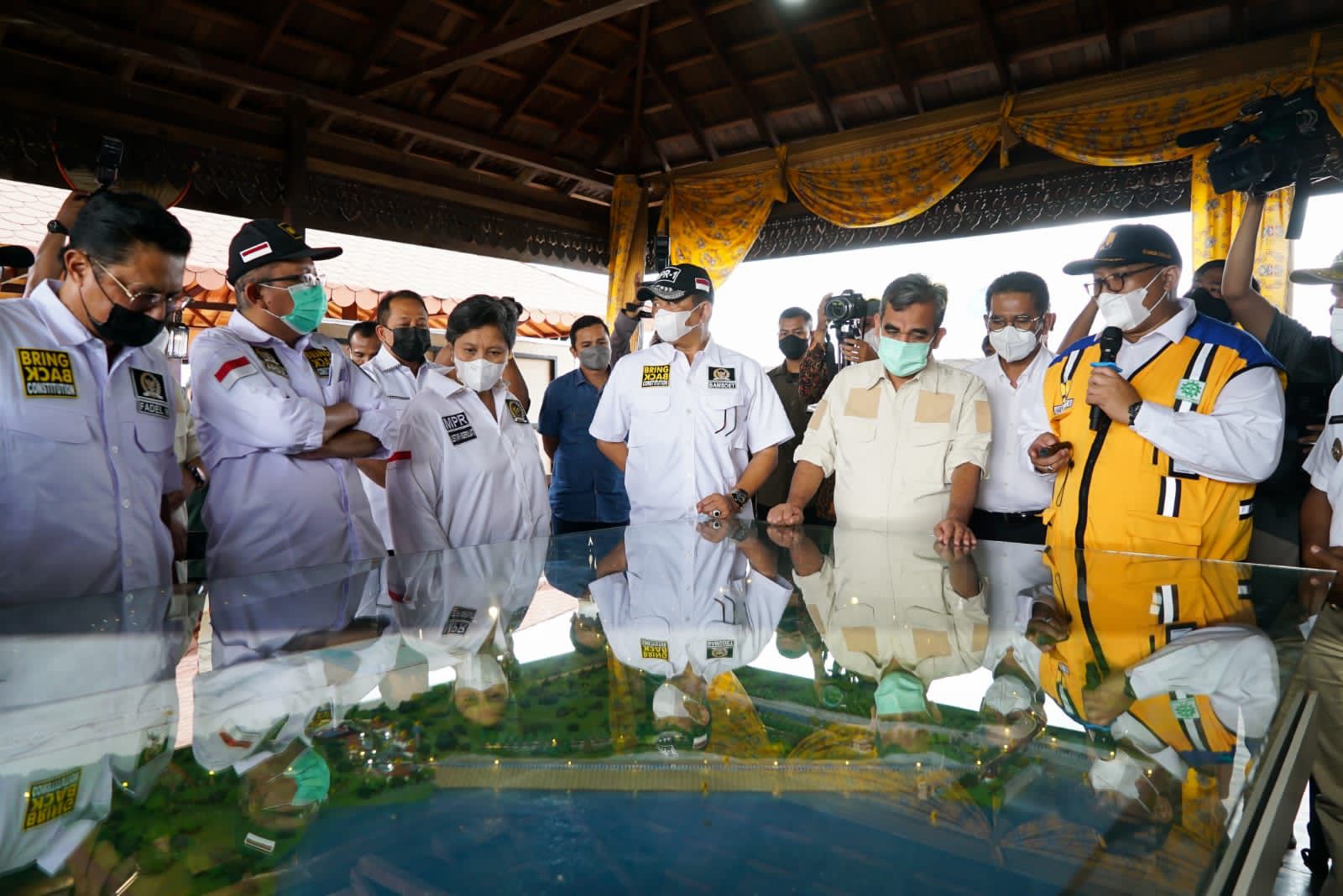KALTIM – Ketua MPR RI Bambang Soesatyo bersama para Wakil Ketua MPR RI, Menteri PPN/Kepala Bappenas Suharso Monoarfa, Menteri PUPR Basuki Hadimuljono, dan Wakil Menteri Keuangan Suahasil Nazara, meninjau lokasi titik nol yang merupakan referensi koordinat pembangunan kompleks Istana Negara dan Pusat Pemerintahan di Kawasan Inti Pusat Pemerintahan (KIPP) Ibu Kota Nusantara (IKN), di Kalimantan Timur. Presiden Joko Widodo menargetkan pada tahun 2024, Istana Negara bersama 4 kementerian yakni Kementerian Sekretaris Negara, Kementerian Dalam Negeri, Kementerian Luar Negeri, dan Kementerian Pertahanan bisa pindah ke IKN.
