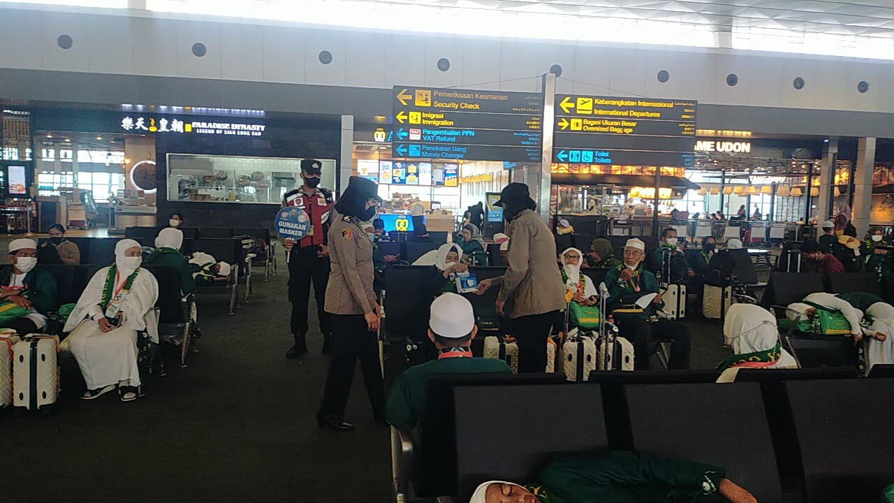 Polwan Bagi-bagikan Masker ke Jamaah Umrah di Bandara Soetta